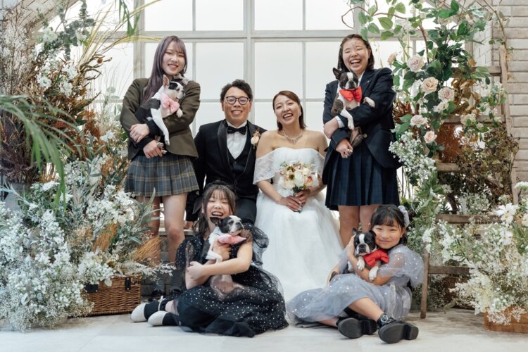 ペットフォトはロケーション撮影、スタジオ撮影どちらでも撮影可能です。ペットとの可愛らしいポージングを交えた写真などきゅんとするウェディングフォトをお届けいたします。