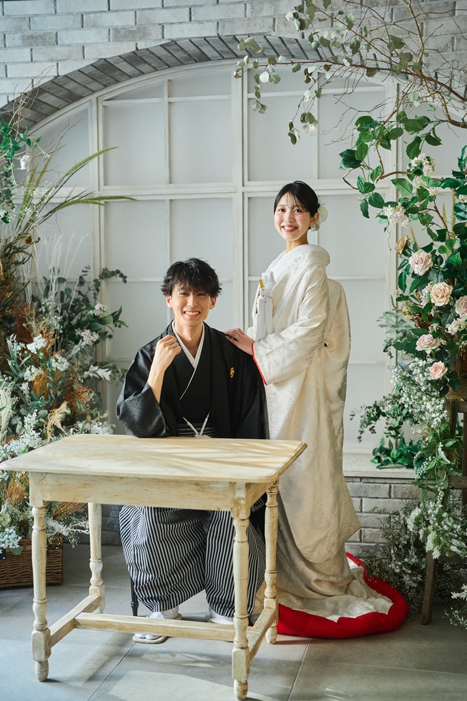 リゾートスタジオのコンセプトに合わせた、ホワイトブリックで組み立てた壁面と、大きなアーチ型の窓がお二人の結婚写真を惹き立ててくれます。