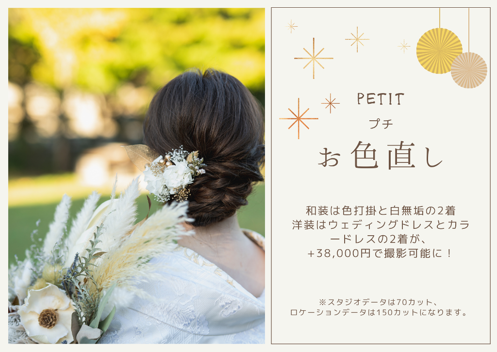 色打掛&白無垢の2着や、ウェディングドレスとカラーの2着、気になるウェディングドレスが2着あるから2着着たい方へ!