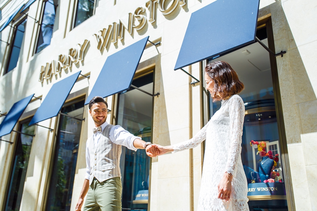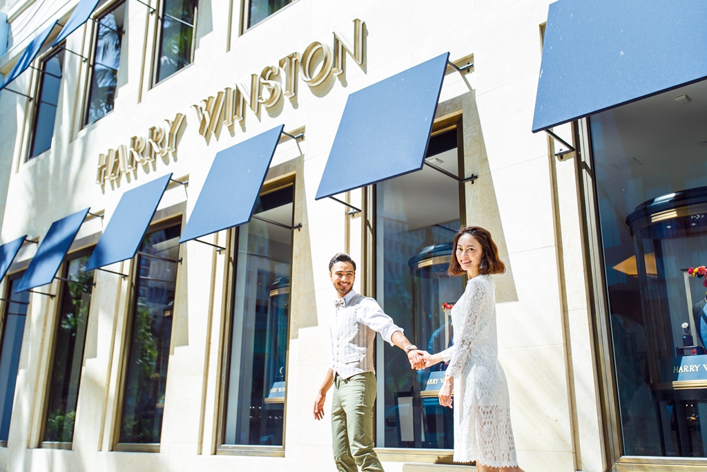 カラフルで洗練されたハリー・ウィンストンの背景を背に撮影したこのショットはいかがでしょう?