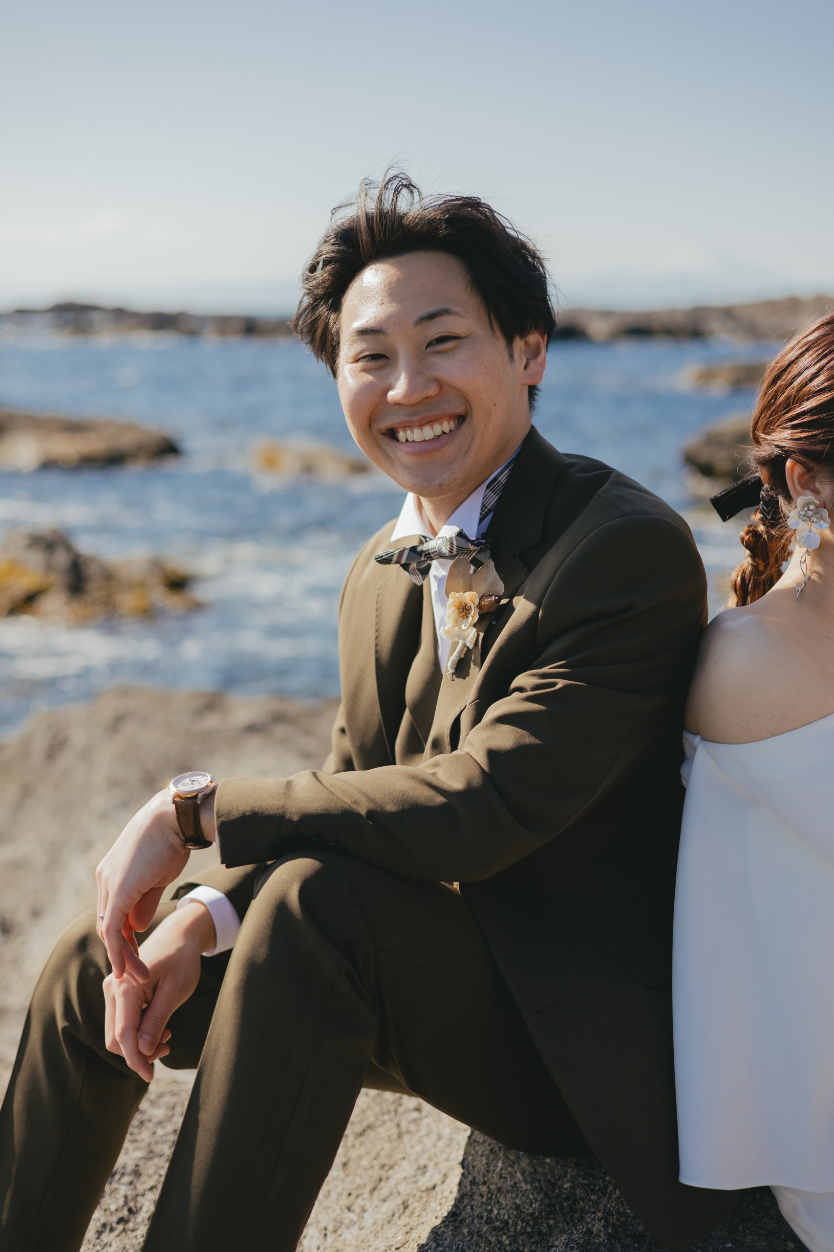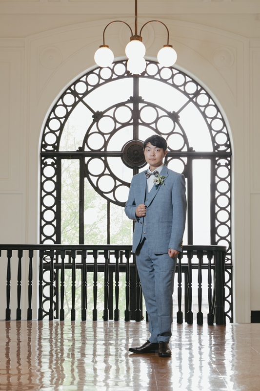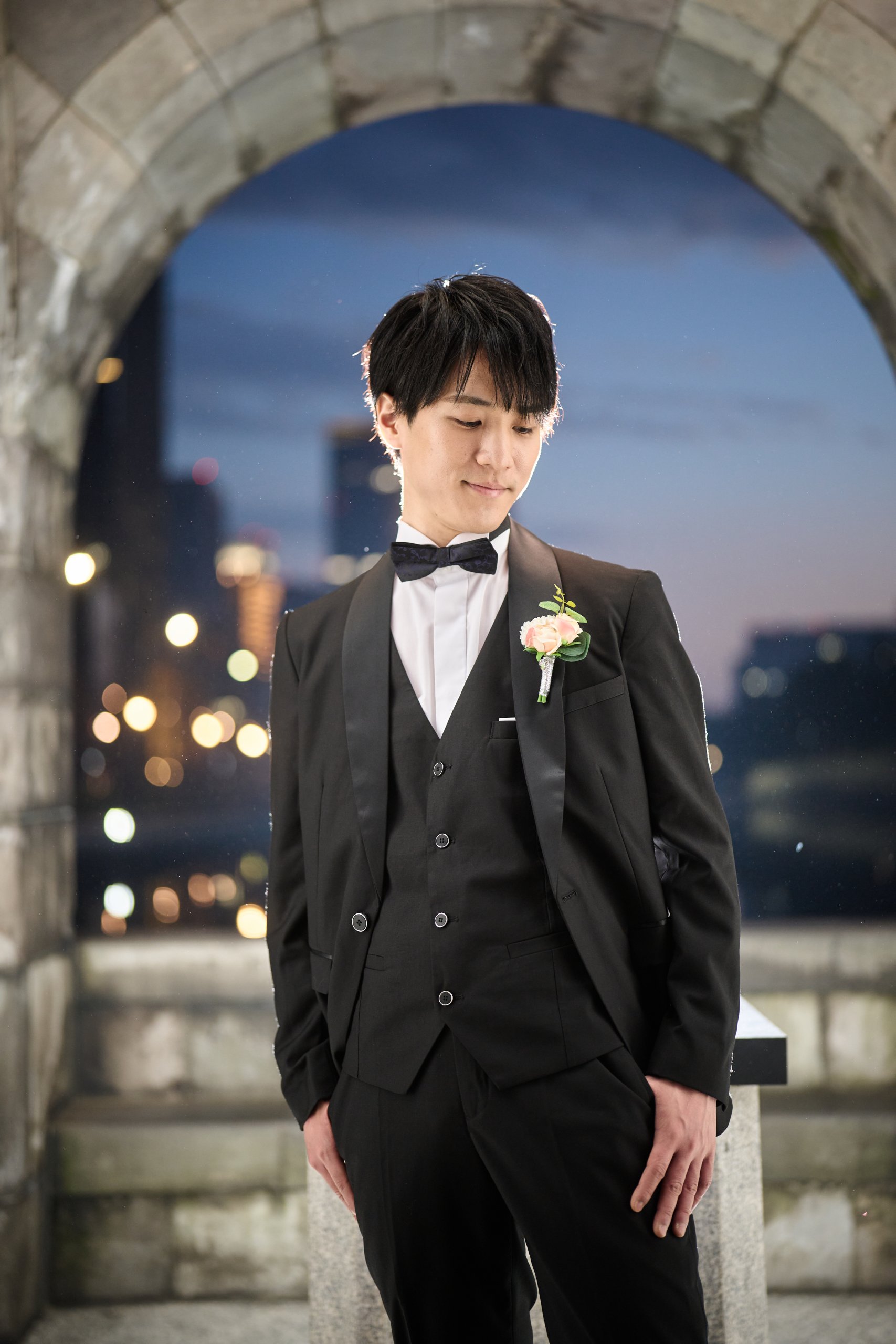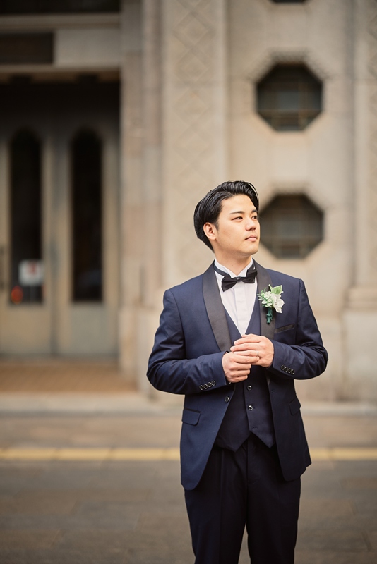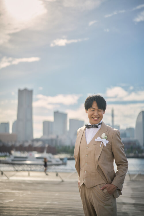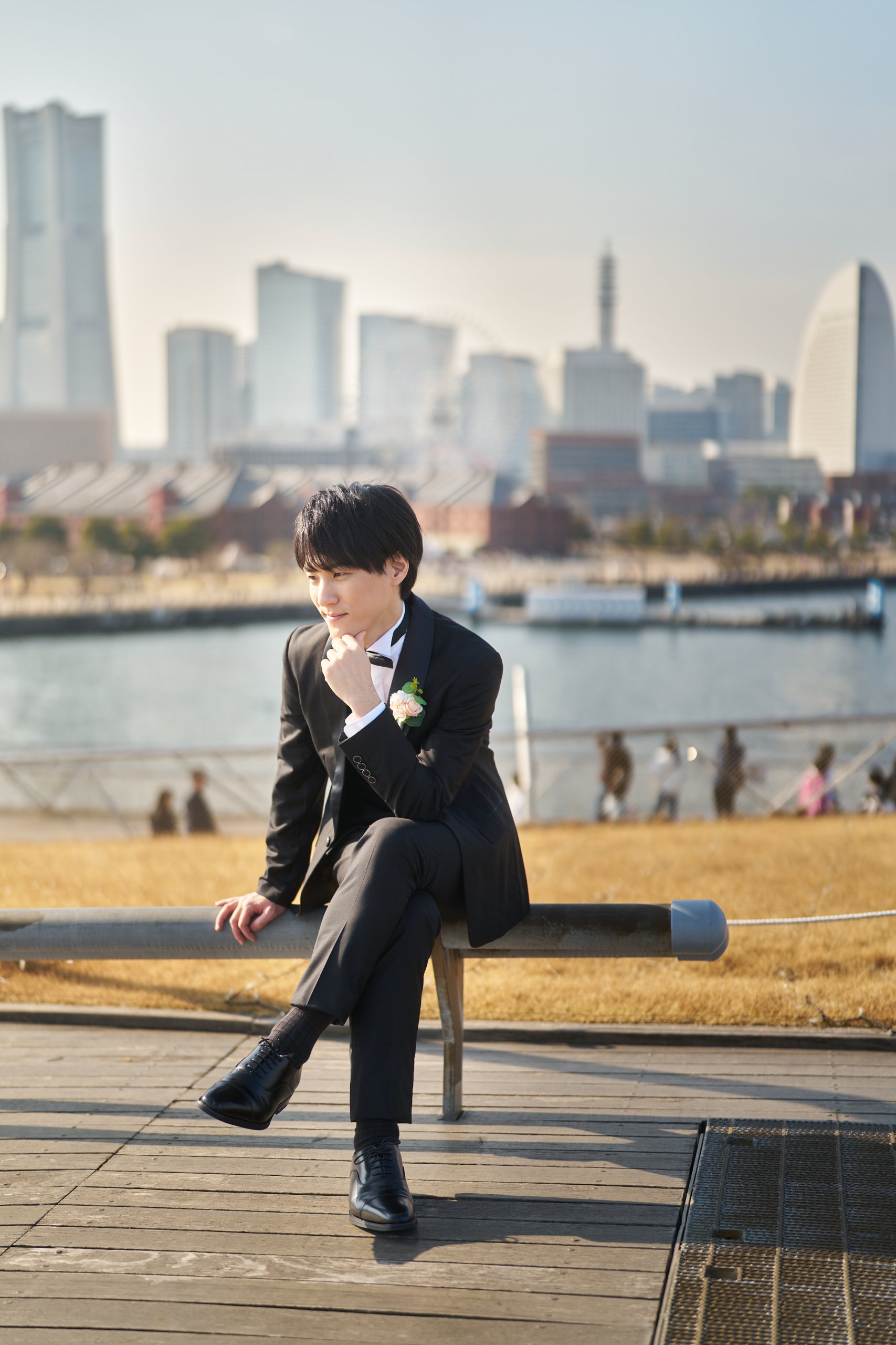 特徴:爽やかな白のタキシード。朝の光をまとったような軽やかな生地が、上品さと清潔感を引き立てます。