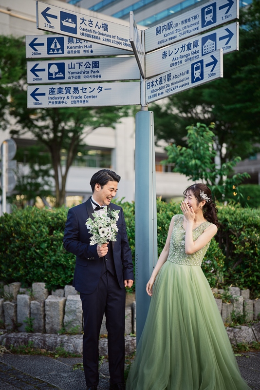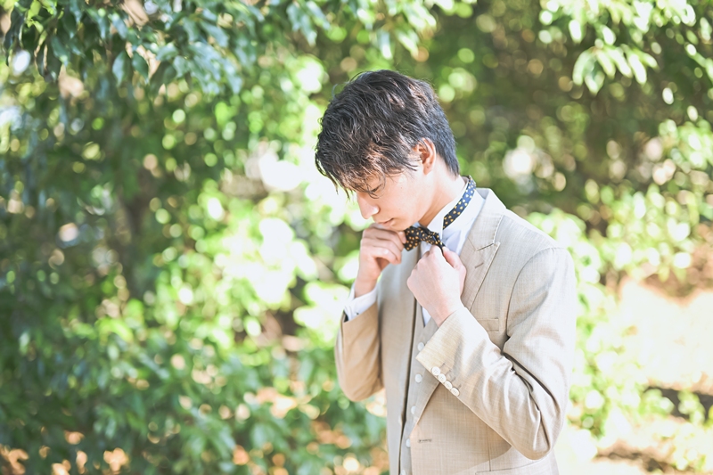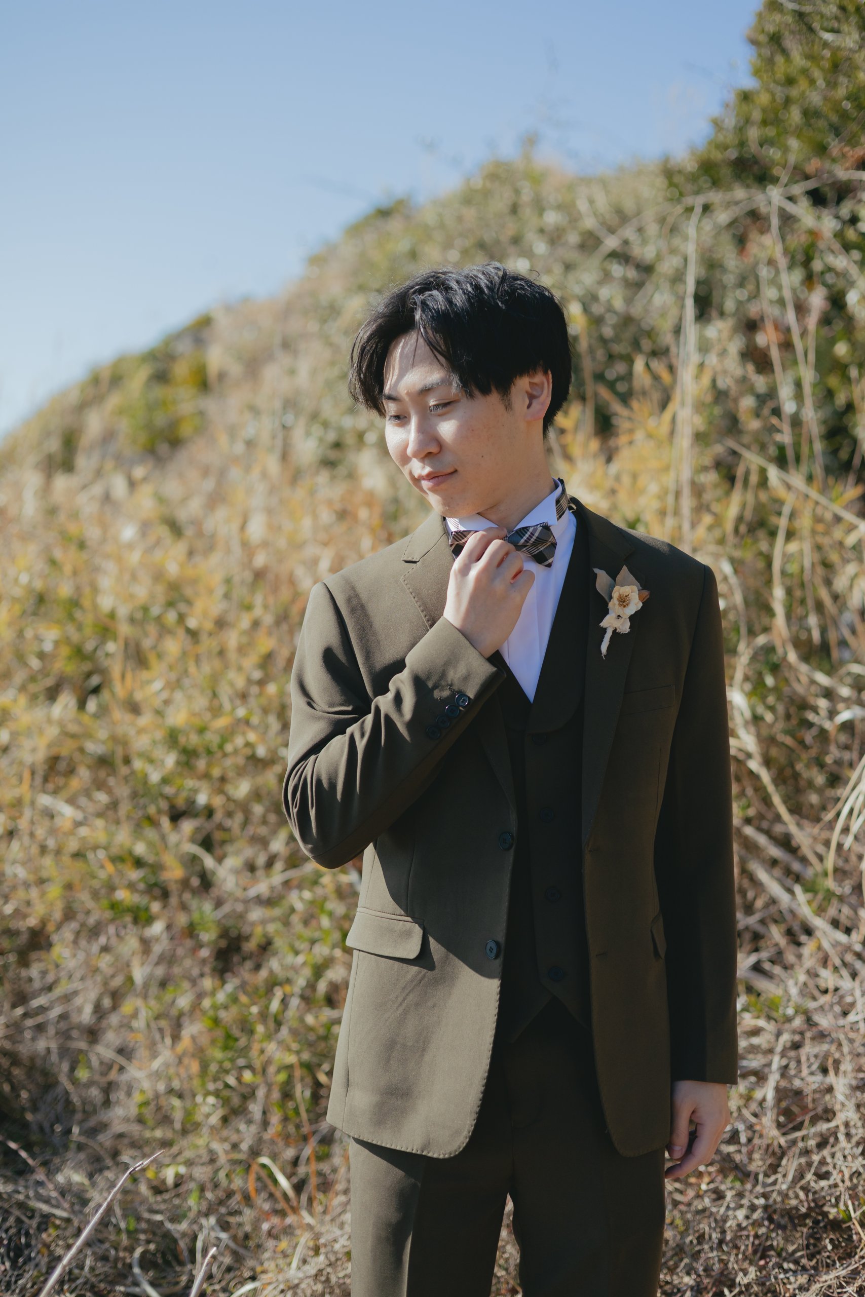特徴:公園など緑のあるロケ地でおすすめのカーキーグリーンのタキシード。