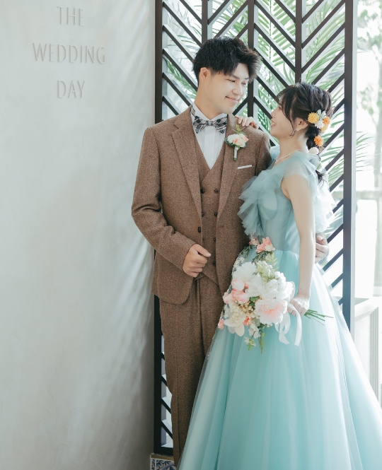 特徴:カカオ色のタキシード。温かみのある生地は冬や屋内での撮影に人気の1着です。