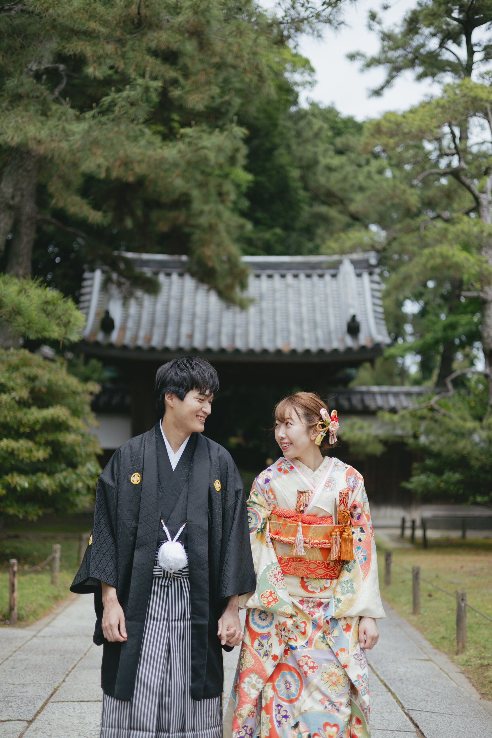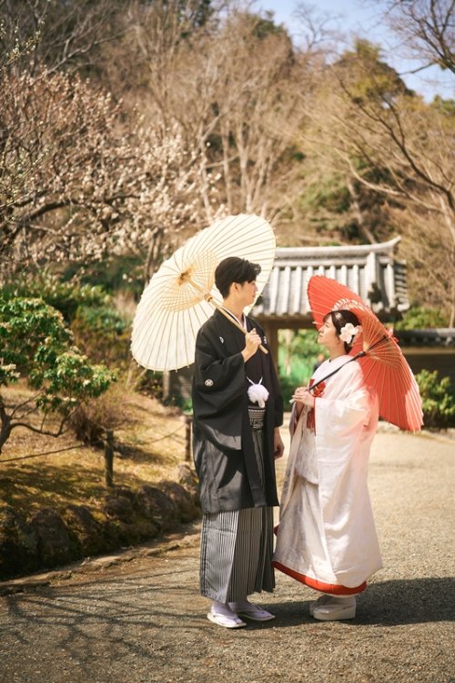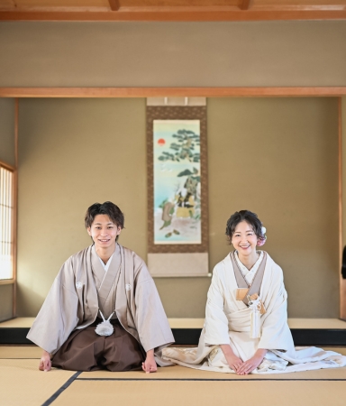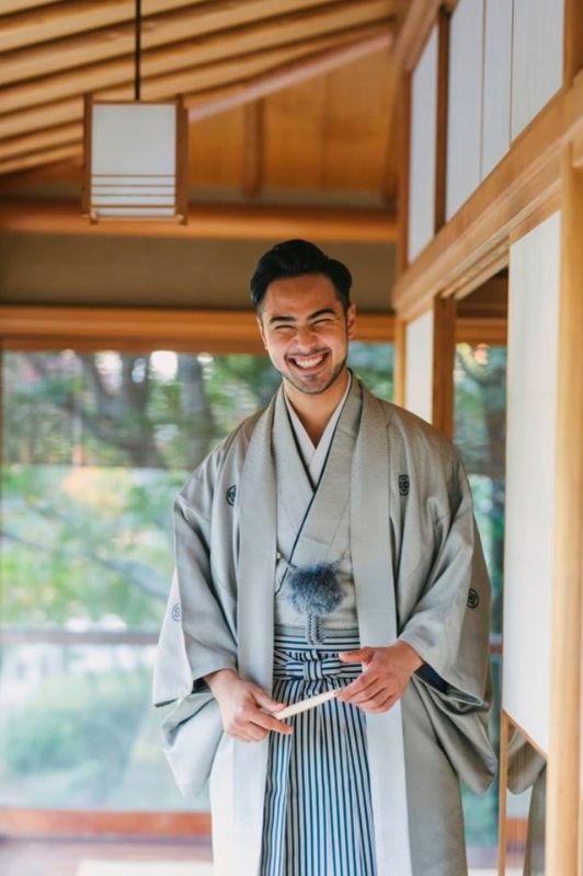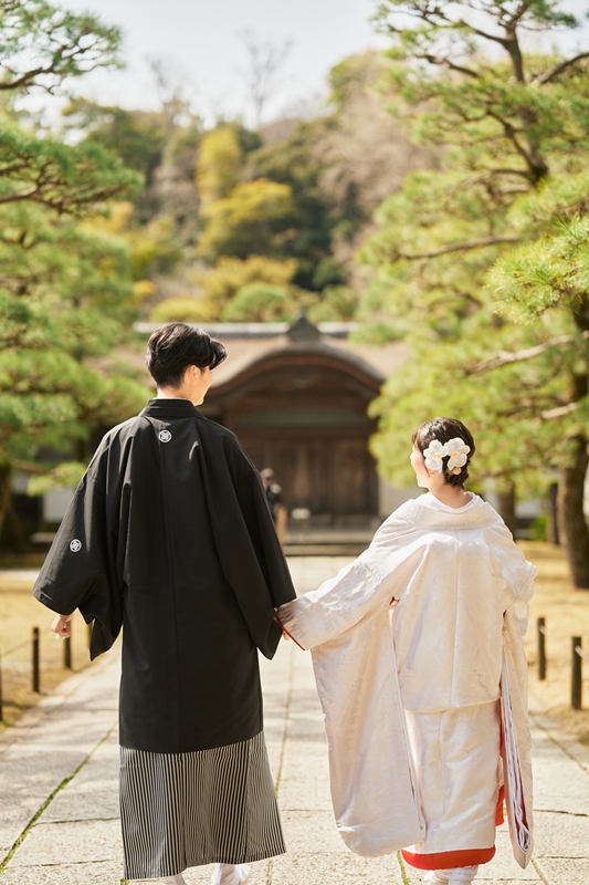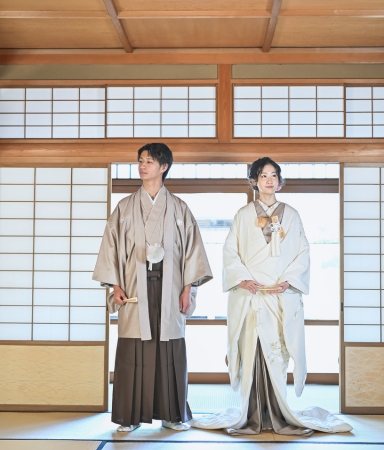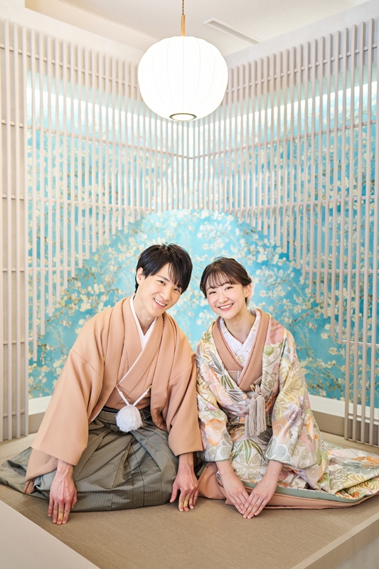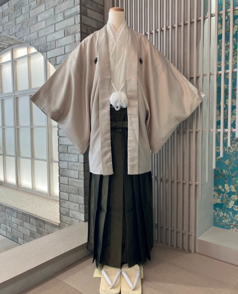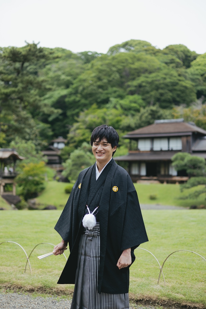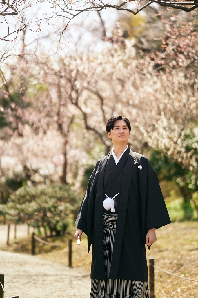 特徴:ご新婦様と合わせて撮影いただける新作の紋付袴。チェックのデザインがイマドキ感でも楽しめますし大正ロマンも感じられます。