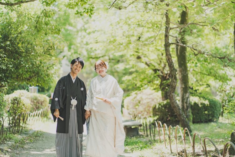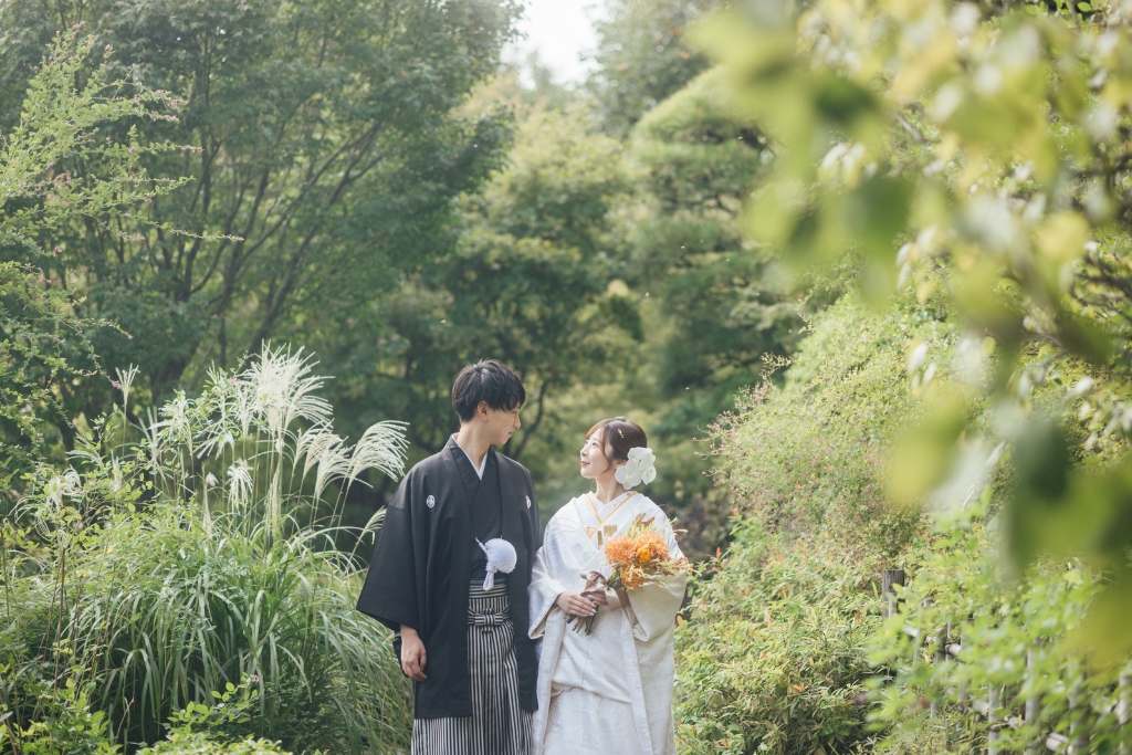 緑が美しいロケーションであれば、どこで撮影してもお二人の和装姿を引き立て、