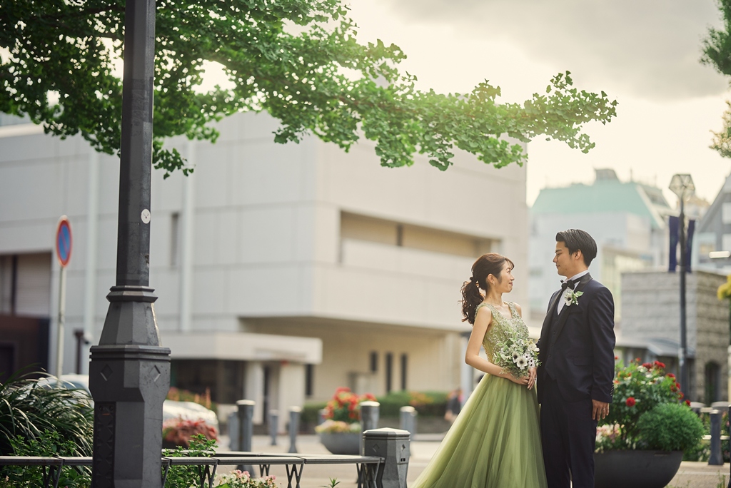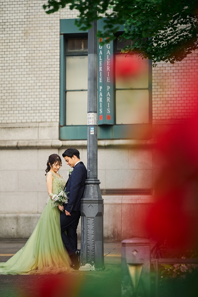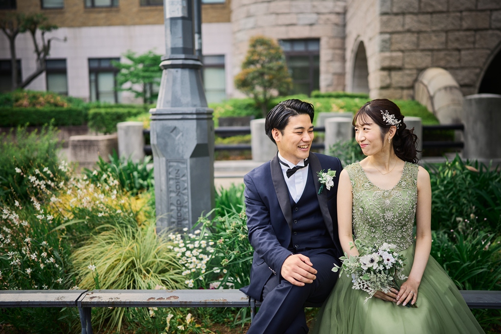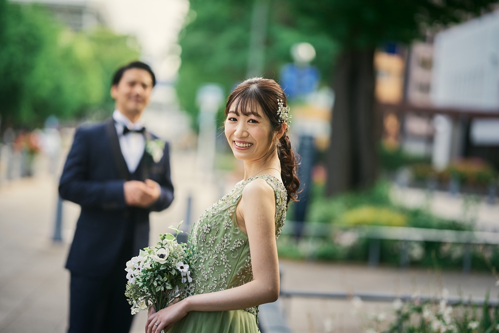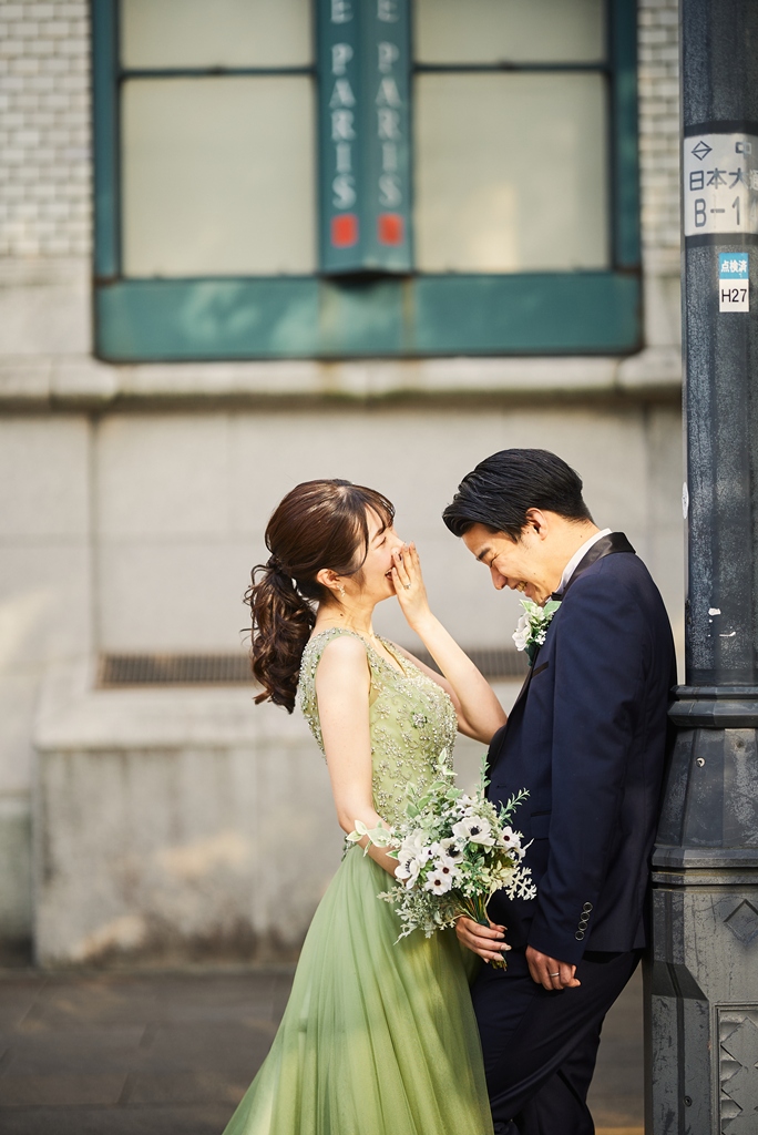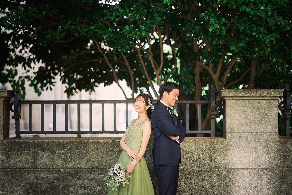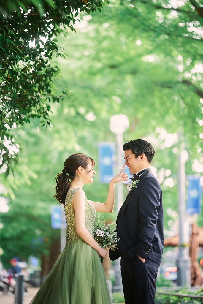 照れ笑いをしながら撮影に臨むお二人の雰囲気に、こちらまで幸せな気持ちにさせていただいてました(*’ω’*)ネイビーのタキシードがお似合いで、大人な雰囲気漂うご新郎様と、ナチュラルかつ綺麗めなグリーンのカラードレスがとてもお似合いなご新婦様♡