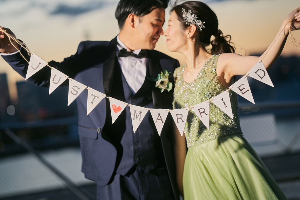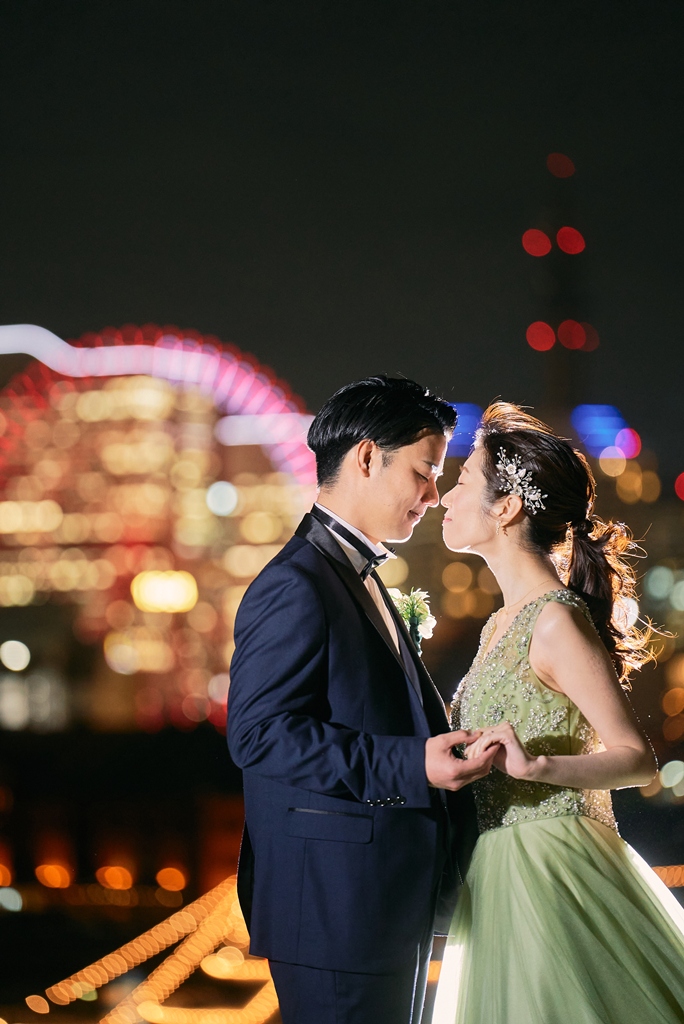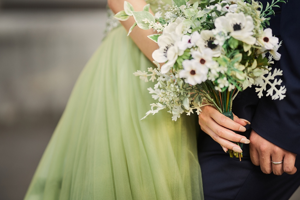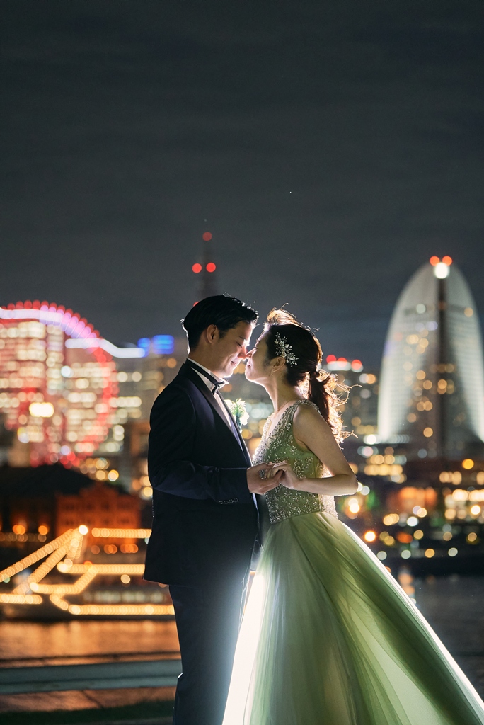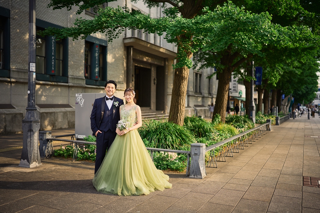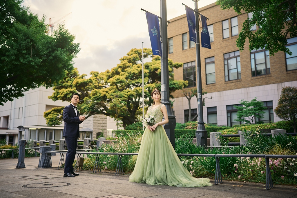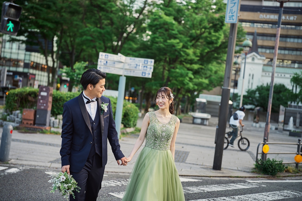 照れ笑いをしながら撮影に臨むお二人の雰囲気に、こちらまで幸せな気持ちにさせていただいてました(*’ω’*)ネイビーのタキシードがお似合いで、大人な雰囲気漂うご新郎様と、ナチュラルかつ綺麗めなグリーンのカラードレスがとてもお似合いなご新婦様♡