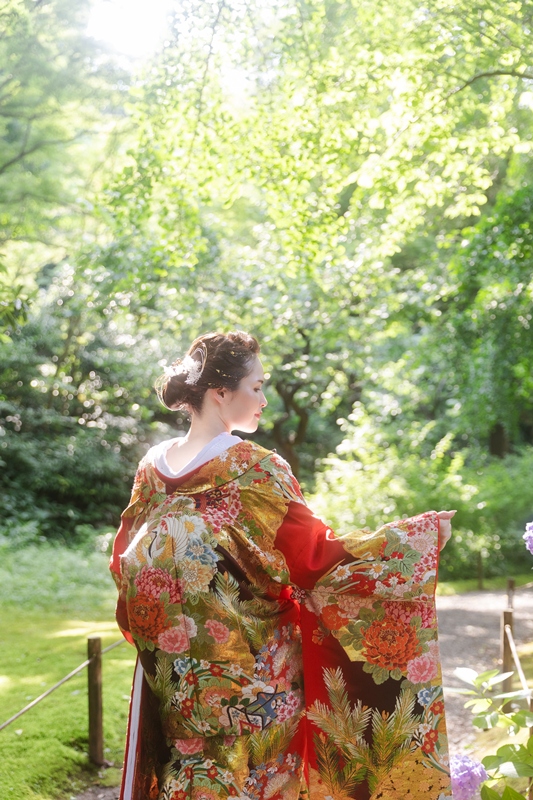 赤色の色打掛がとてもお似合いでお庭の緑と空の青とも相性ばっちりでした!