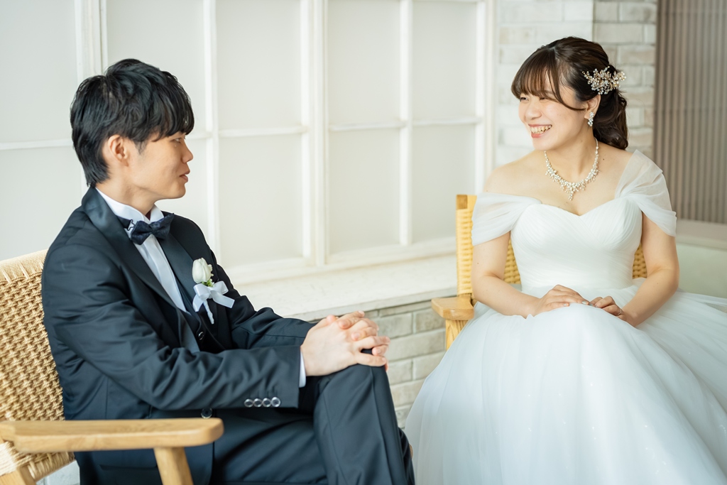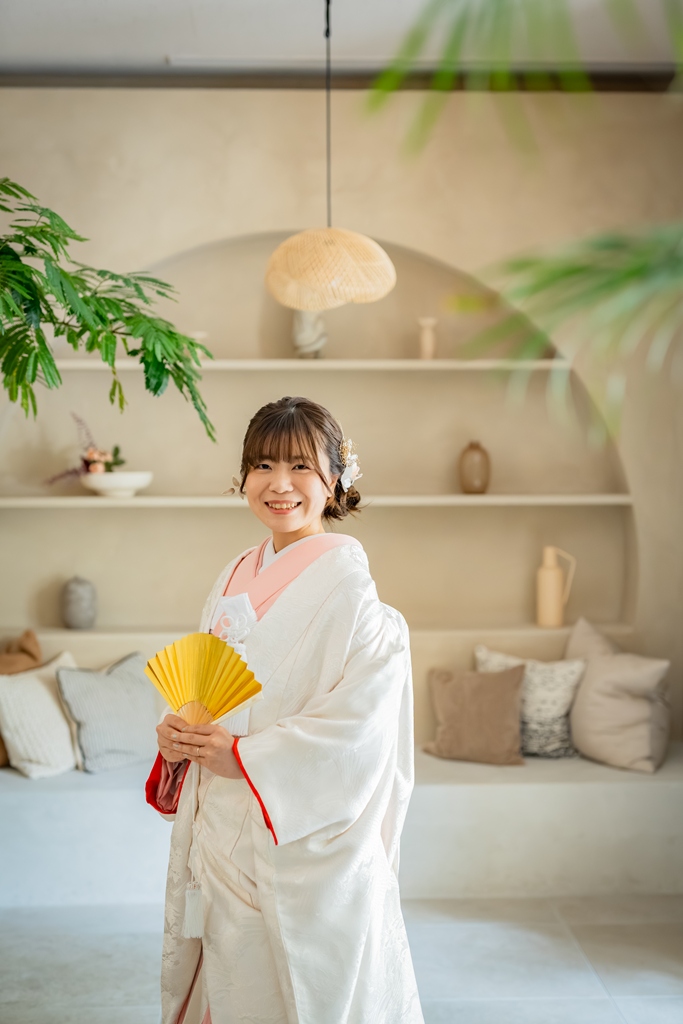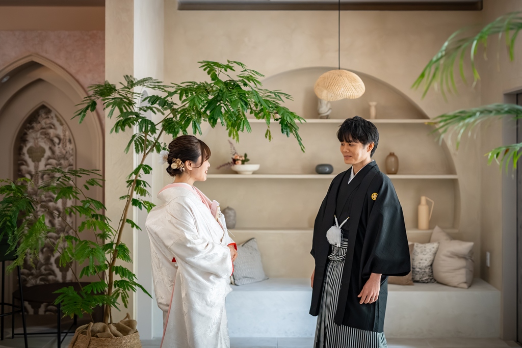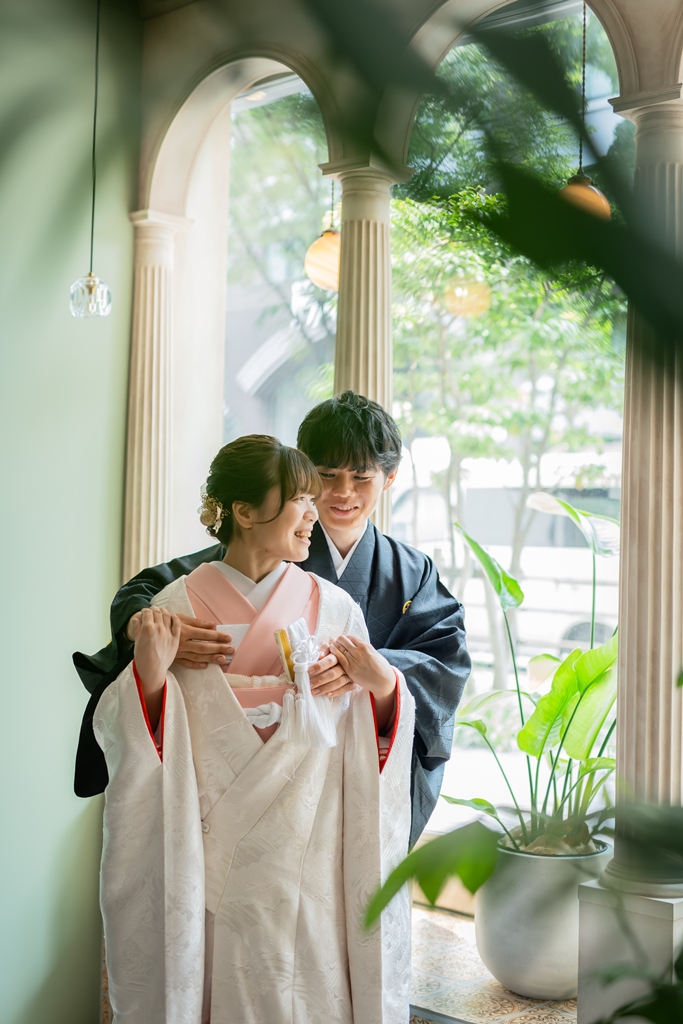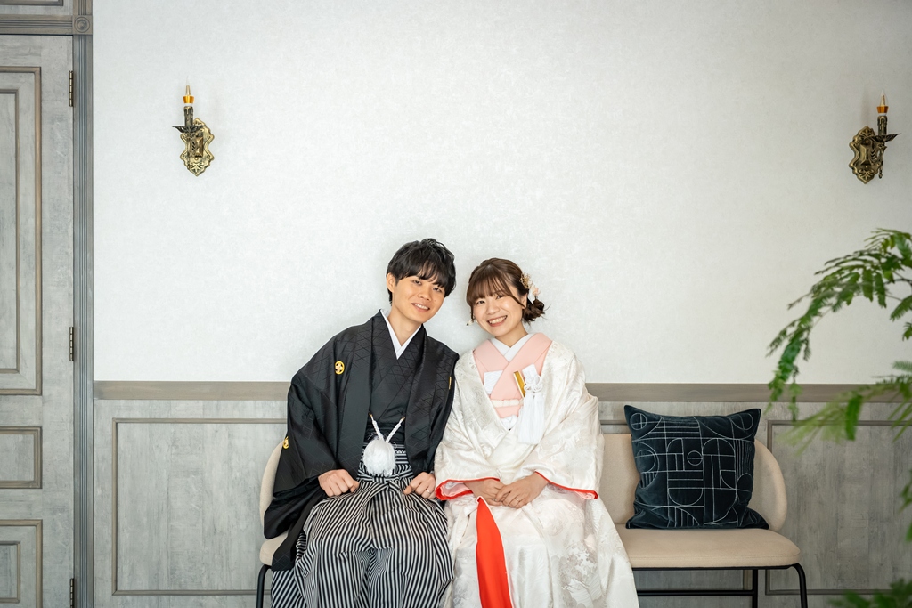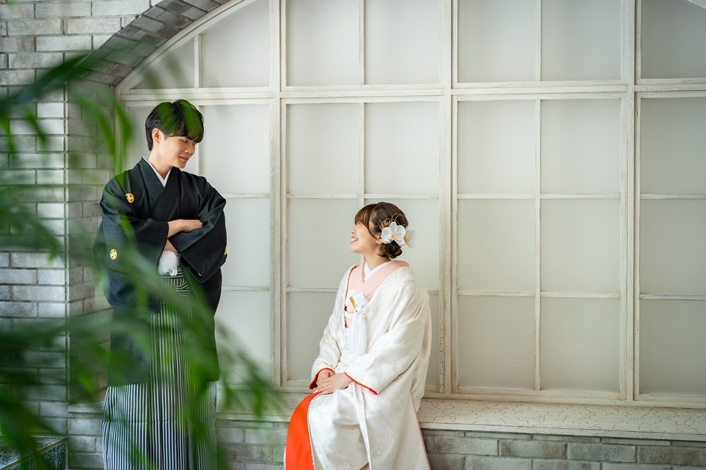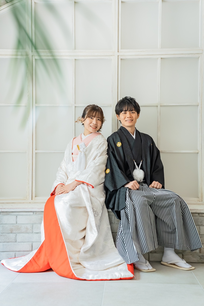 一方、和装では一転して、日本の伝統美を感じさせる落ち着いた気配と凛とした空気感がスタジオ全体を包み込みました。おふたりが紡ぎ出す柔らかな笑顔や視線には、和装ならではの深みと格調が漂い、ひとつひとつの瞬間が「永遠に残したい一枚」として形になっていきました。