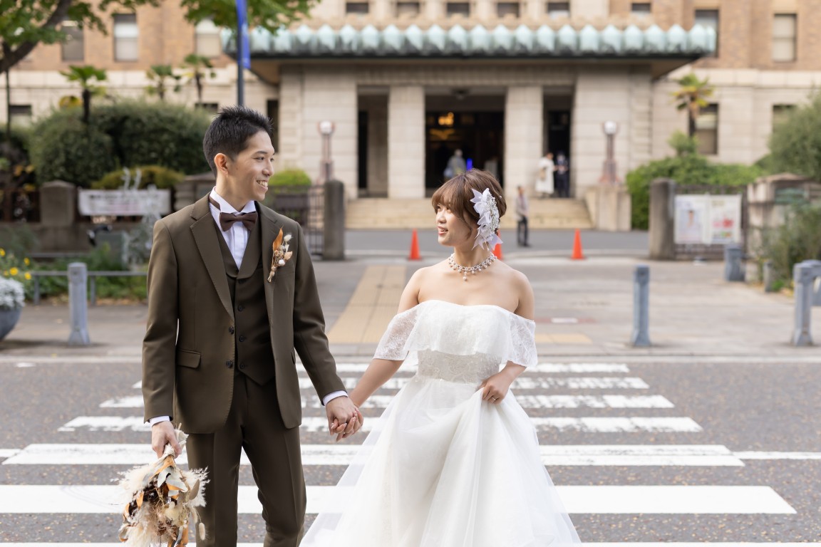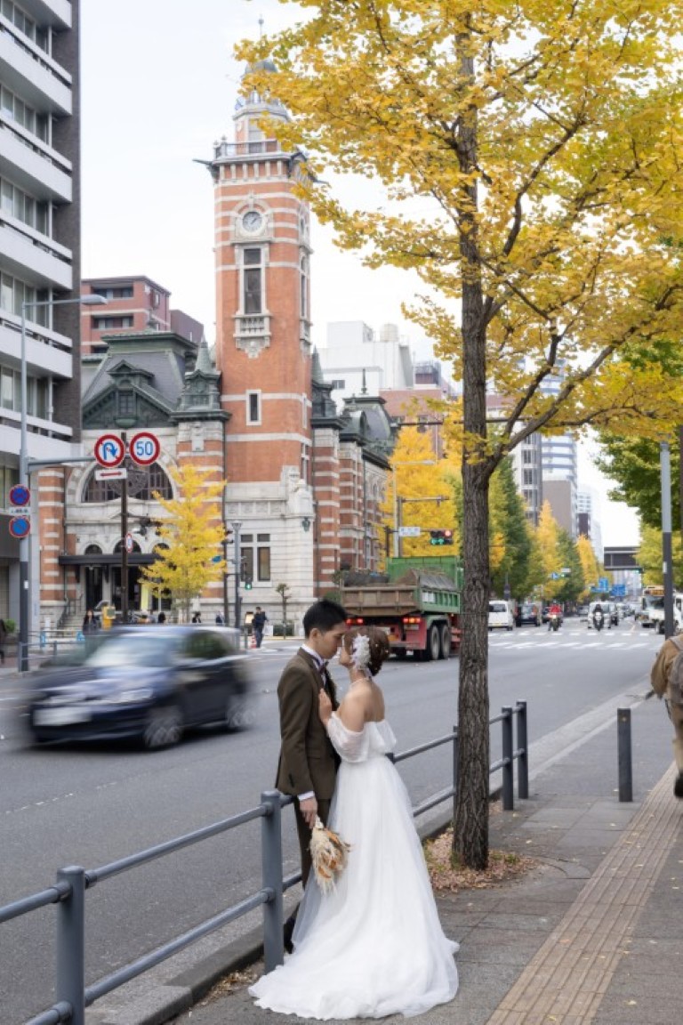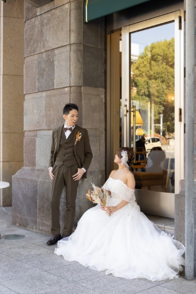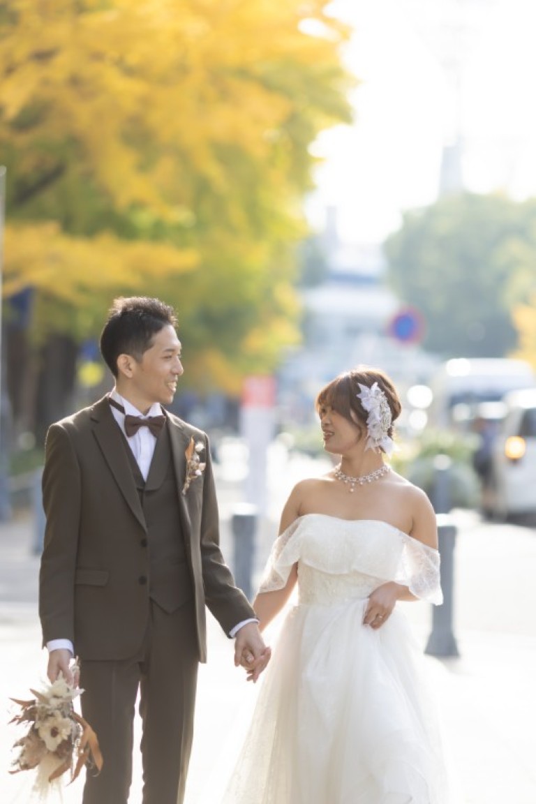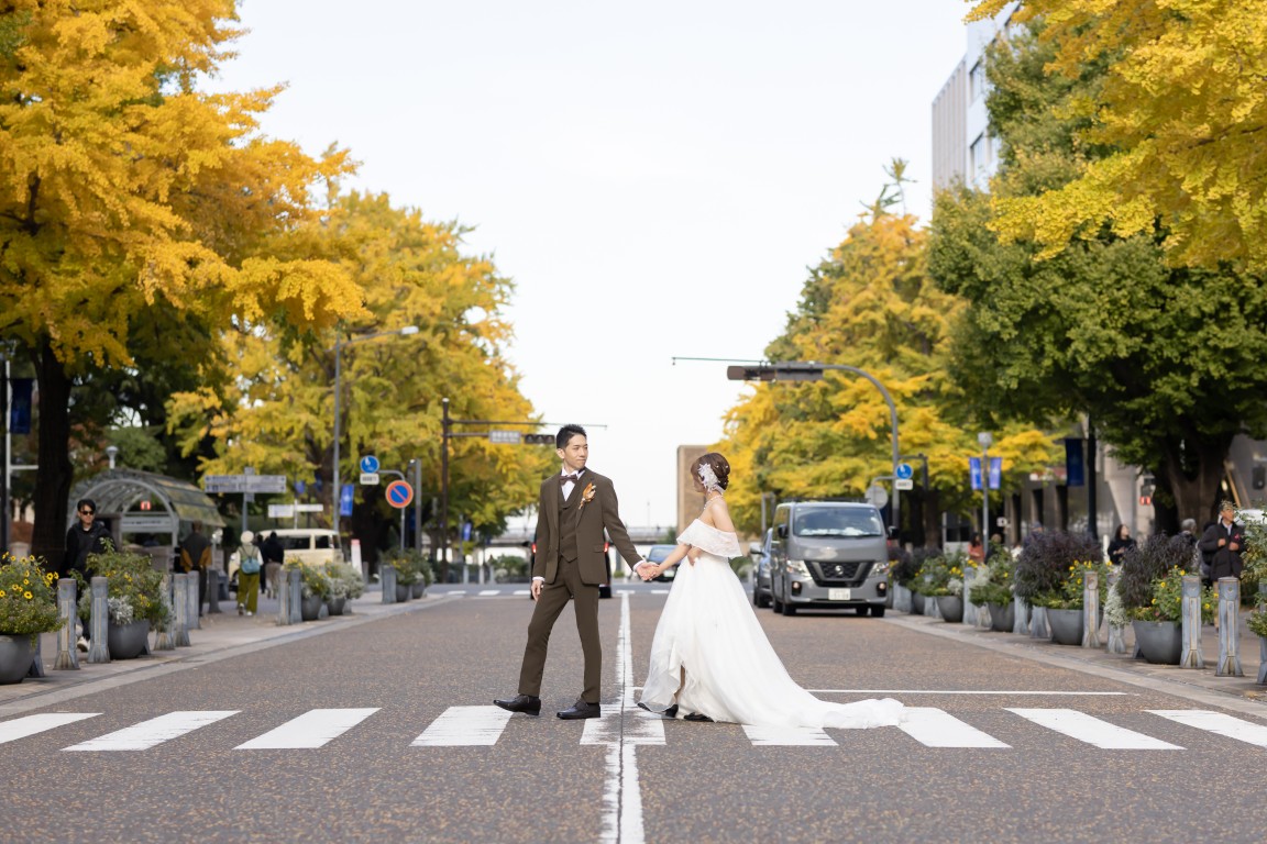 2人でもよく横浜に来ていたこともあって、ロケーションは横浜が良いなぁと考えておりました。打ち合わせをしていただいた際、その時期でしたら日本大通りの紅葉が綺麗ですよと話してくださり、ここを選びました。