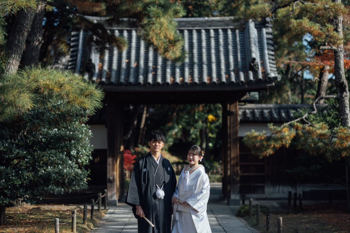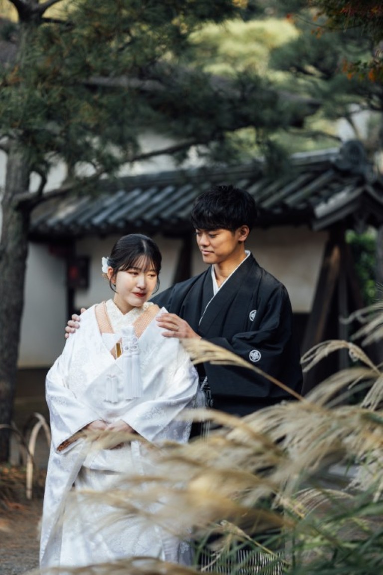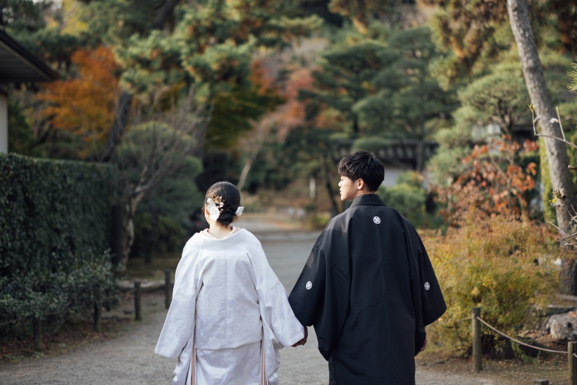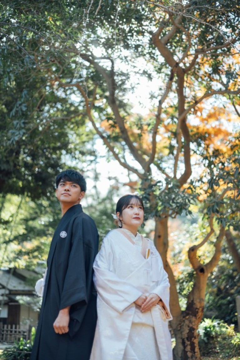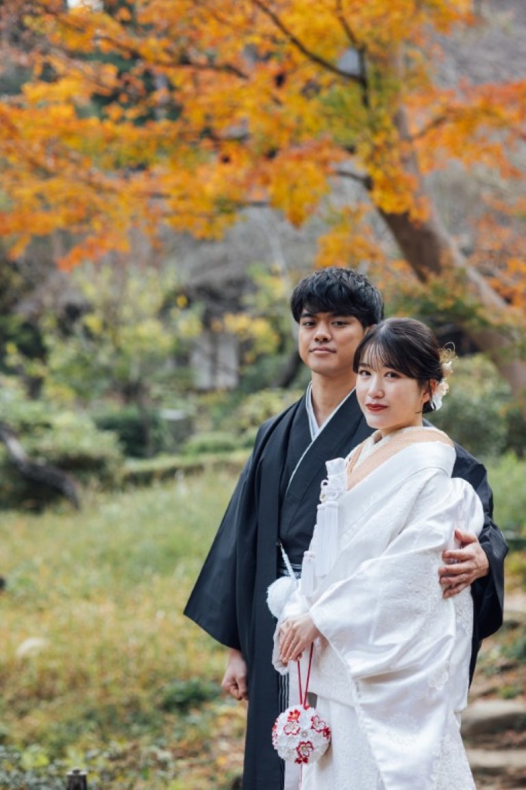 結婚式当日は洋装を2着着る予定なので、写真では和装の姿もきちんと残したいと思い、前撮りは和装で撮影することにしました。せっかくなら和装が映える場所を選びたくて、自然豊かな庭園をいくつか見ていたところ、紅葉がほんのり残る時期の三渓園がとても魅力的に感じました。歴史ある建物と季節の景色が和装とよく合うと思い、この場所を選びました。