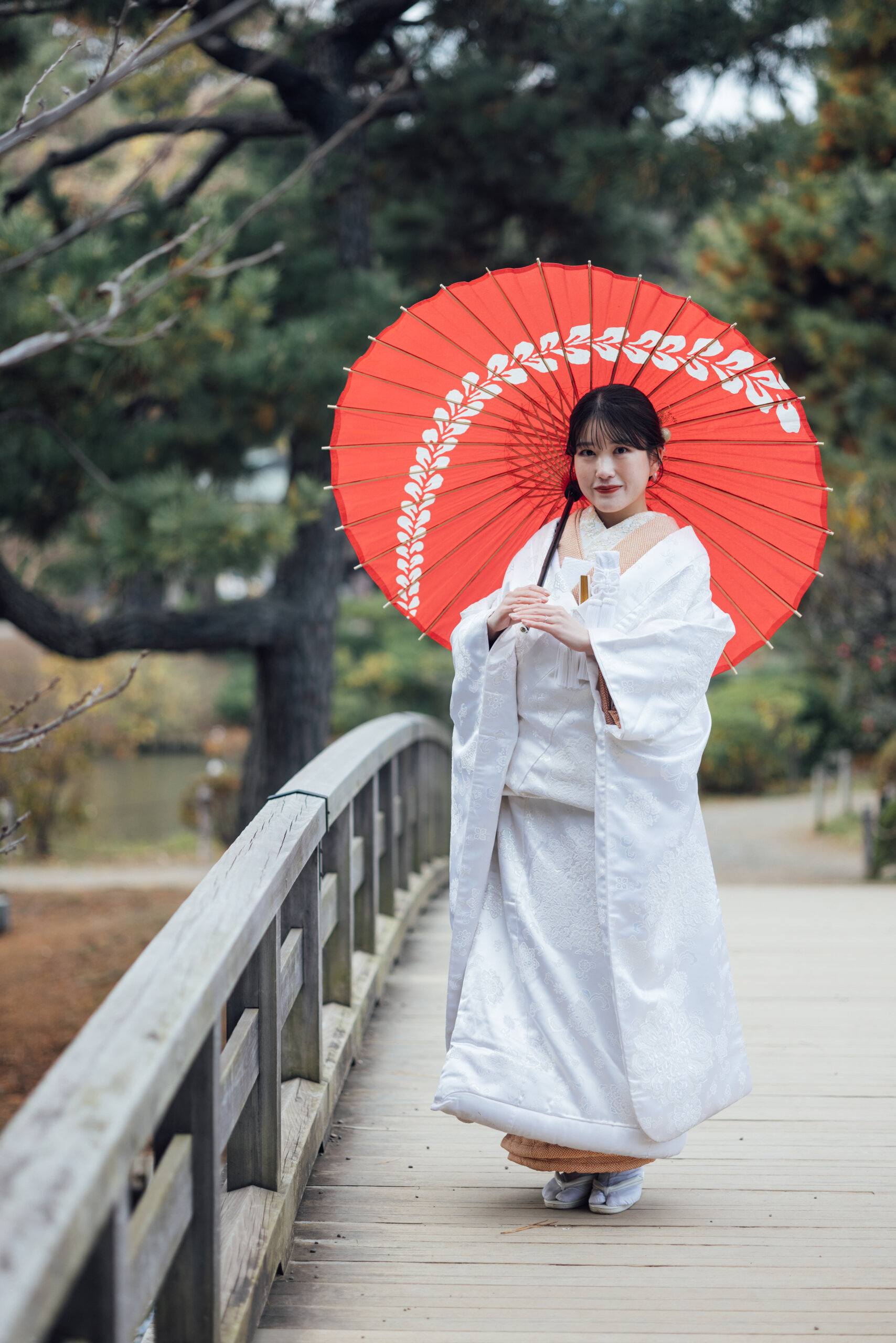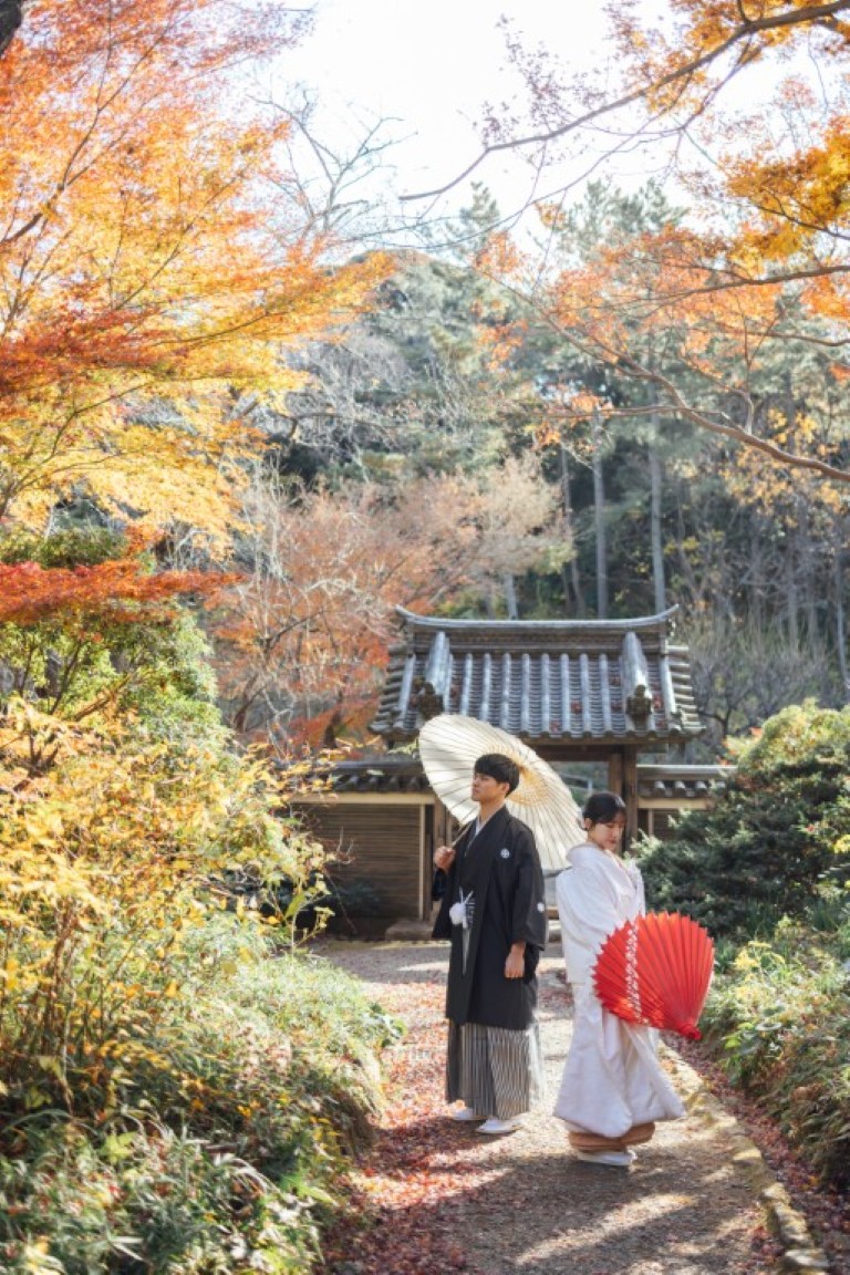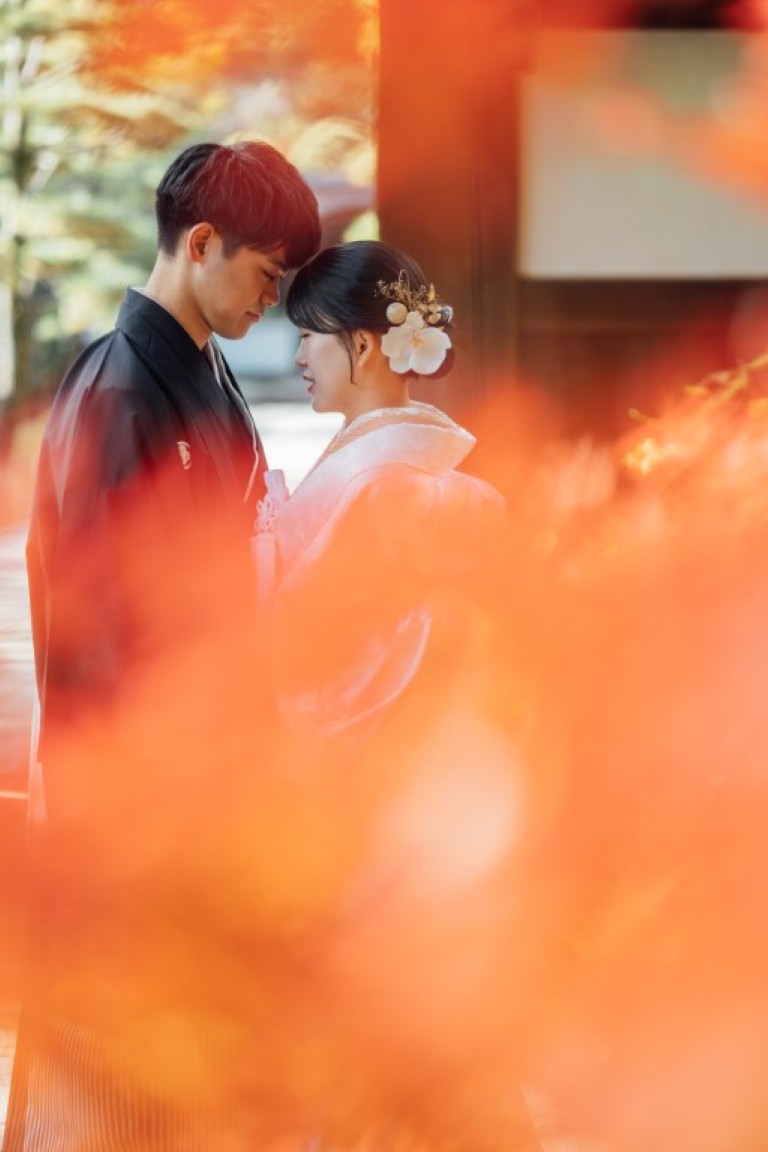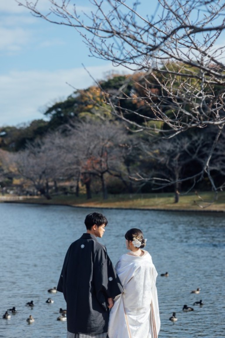 結婚式当日は洋装を2着着る予定なので、写真では和装の姿もきちんと残したいと思い、前撮りは和装で撮影することにしました。せっかくなら和装が映える場所を選びたくて、自然豊かな庭園をいくつか見ていたところ、紅葉がほんのり残る時期の三渓園がとても魅力的に感じました。歴史ある建物と季節の景色が和装とよく合うと思い、この場所を選びました。